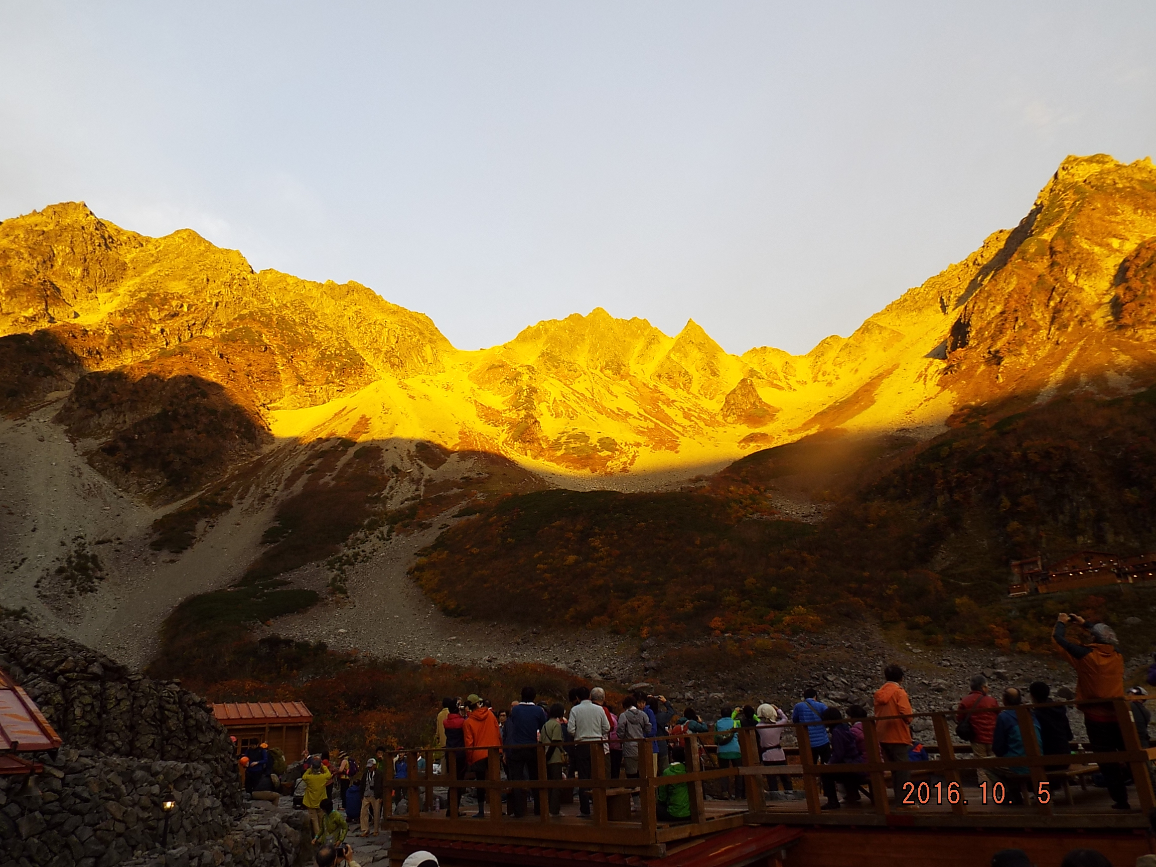 モルゲンロートに輝く奥穂高岳(左)・涸沢岳(中)・北穂高岳(右)