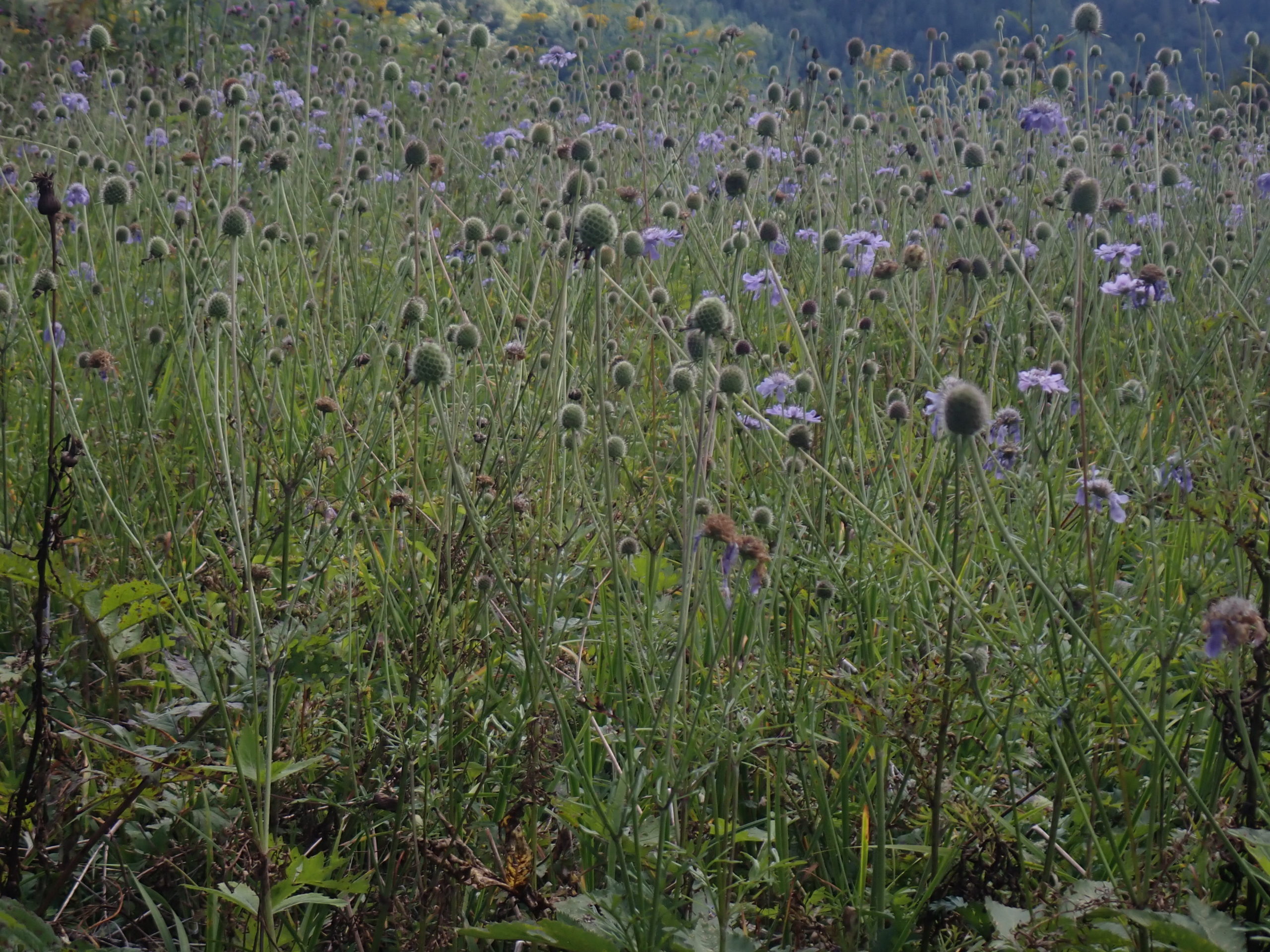 下界では酷暑が続いていますが、櫛形山では着実に季節が進行しており、タムラソウ(田村草)の見事な群生や可憐なシロヨメナ(白嫁菜)等を見ることができました。なお、池の茶屋登山口周辺のサラシナショウマ(晒菜升麻)の群生地は以前のネット柵の一部損壊による鹿の食害のためか昨年より花数は若干少ないようですが健気に咲き誇っていました。
